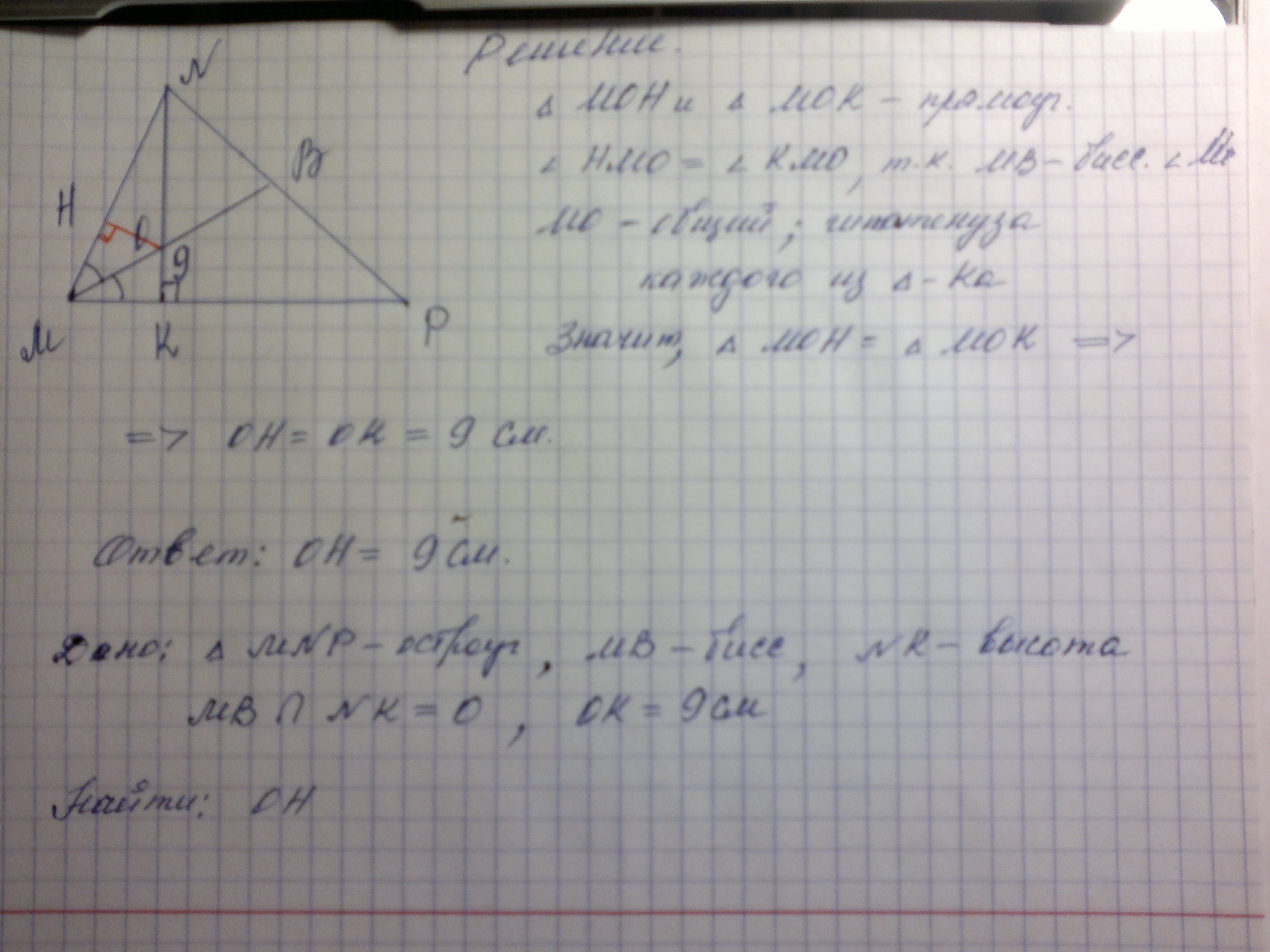 в остроугольном треугольнике MNP биссектриса угла М пересекает высоту NK в точке О,причем ОК=9см.Найдите расстояние от точки О до прямой MN
