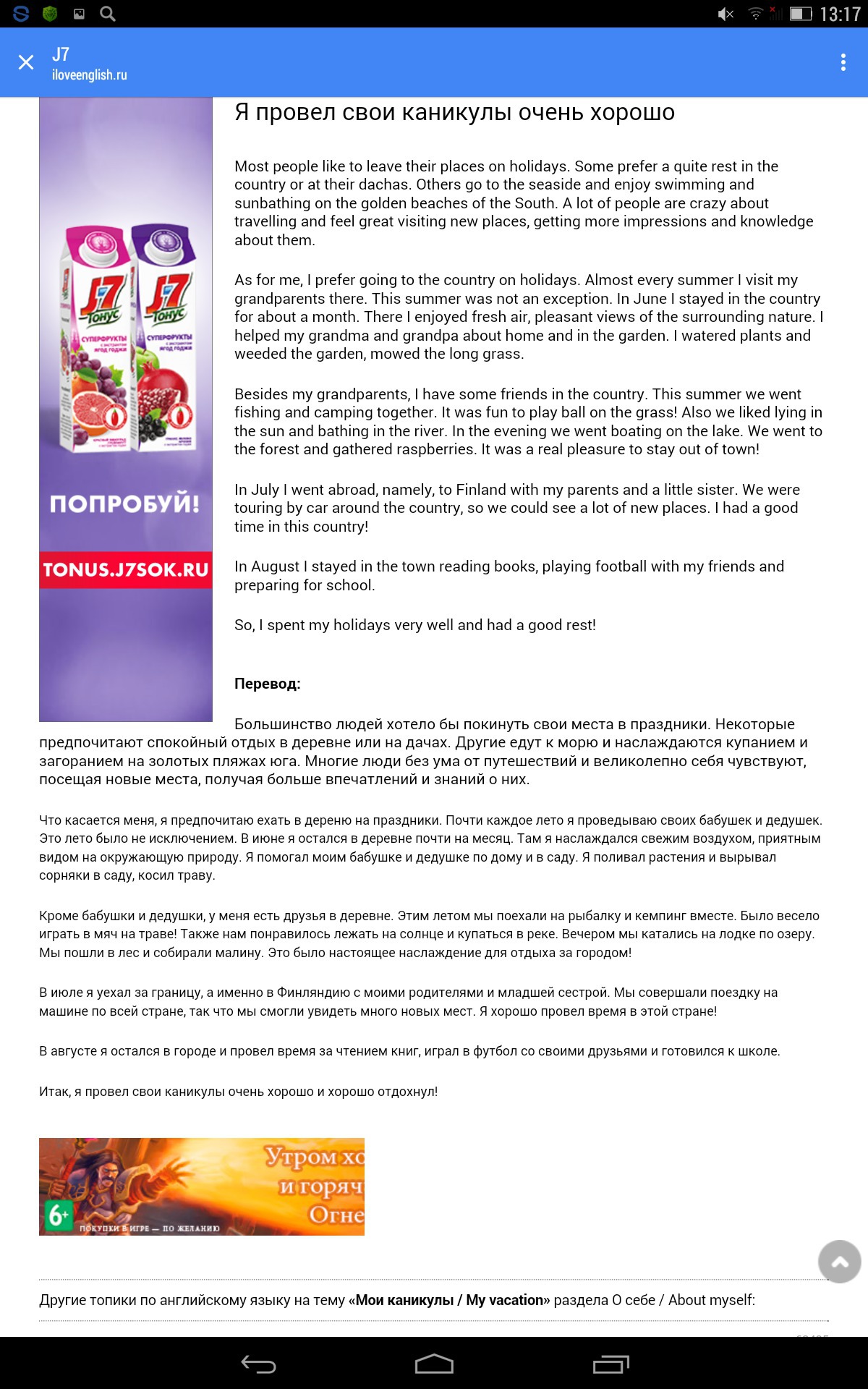 Besides my grandparents, I have some friends in the country. This summer we went fishing and camping together. It was fun to play ball on the grass! Also we liked lying in the sun and bathing in the river. In the evening we went boating on the lake. We went to the forest and gathered raspberries. It was a real pleasure to stay out of town!