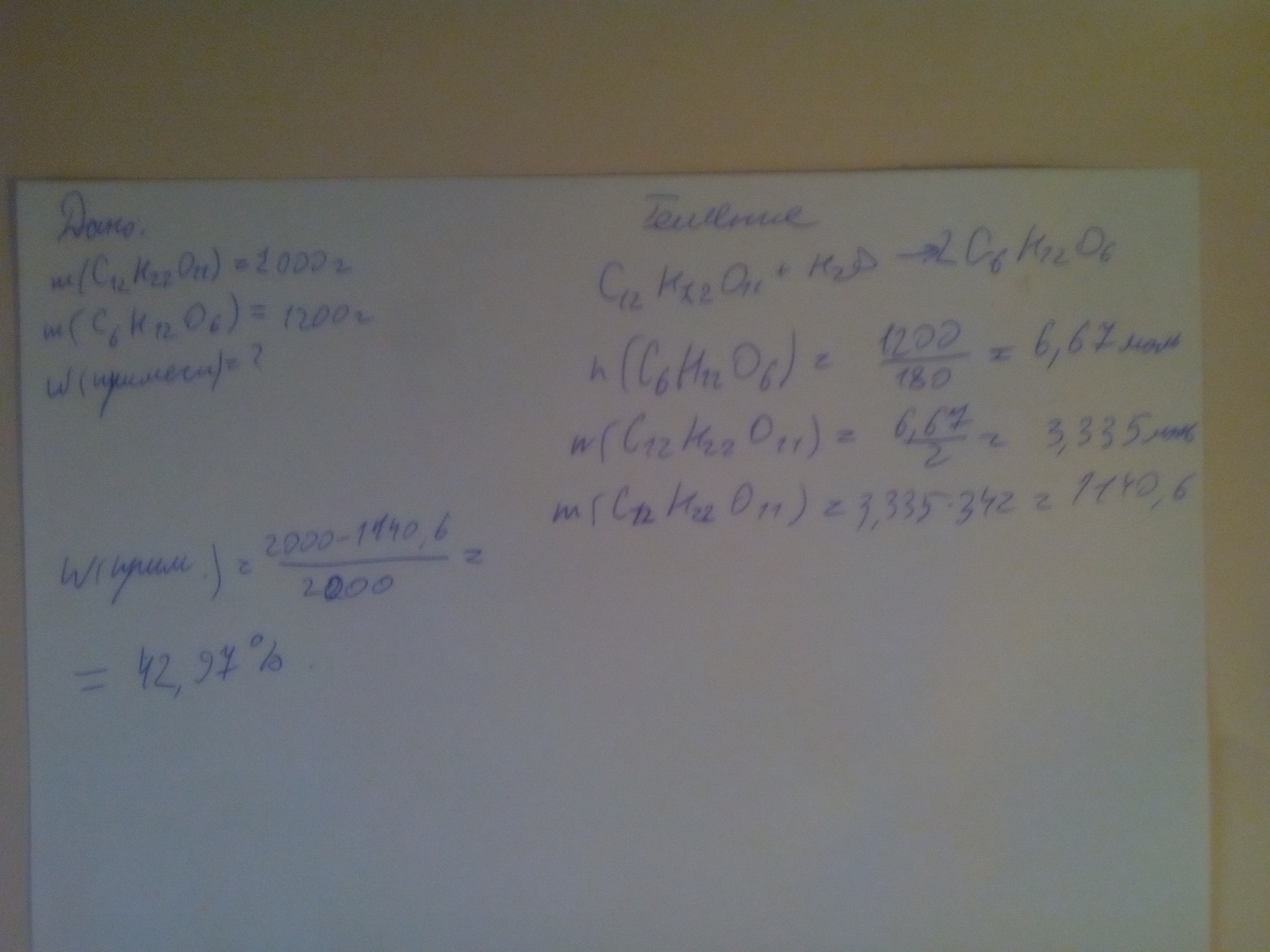 Найдите массовую долю примесей в сахарозе, если из 2 кг сахарозы получена глюкоза массой 1,2 кг( Если можно то ФОТО решения пожалуйста, спасибо большое заранее)
