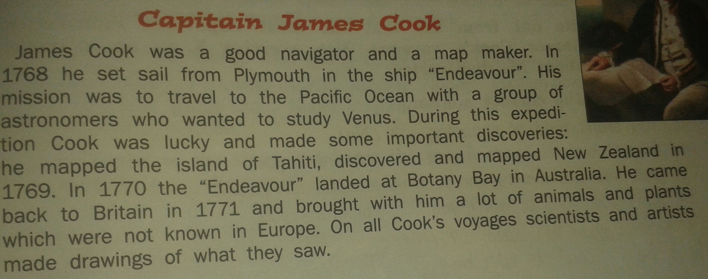 Джеймс Кук был хорошим мореплавателем и автором навигационных карт. В 1768 году он отправился в плавание из города Плимута на своем корабле под названием "Стремительный". Его целью было добраться до Атлантического океана с группой астрономов, которые хотели изучить Венеру. Во время этой экспедиции Куку повезло и он совершил ряд важный открытий : он отобразил на карте остров Таити, открыл и занес на карту Новую Зеландию в 1769 году. В 1770 его корабль заплыл в Ботаническую Бухту в Австралии. А в 1771 году Кук вернулся в Англию и привез с собой большое количество животных и растений, до сих пор неизвестных в Европе. За всё время путешествий Кука ученые и художники делали зарисовки того, чему им приходилось быть свидетелями.