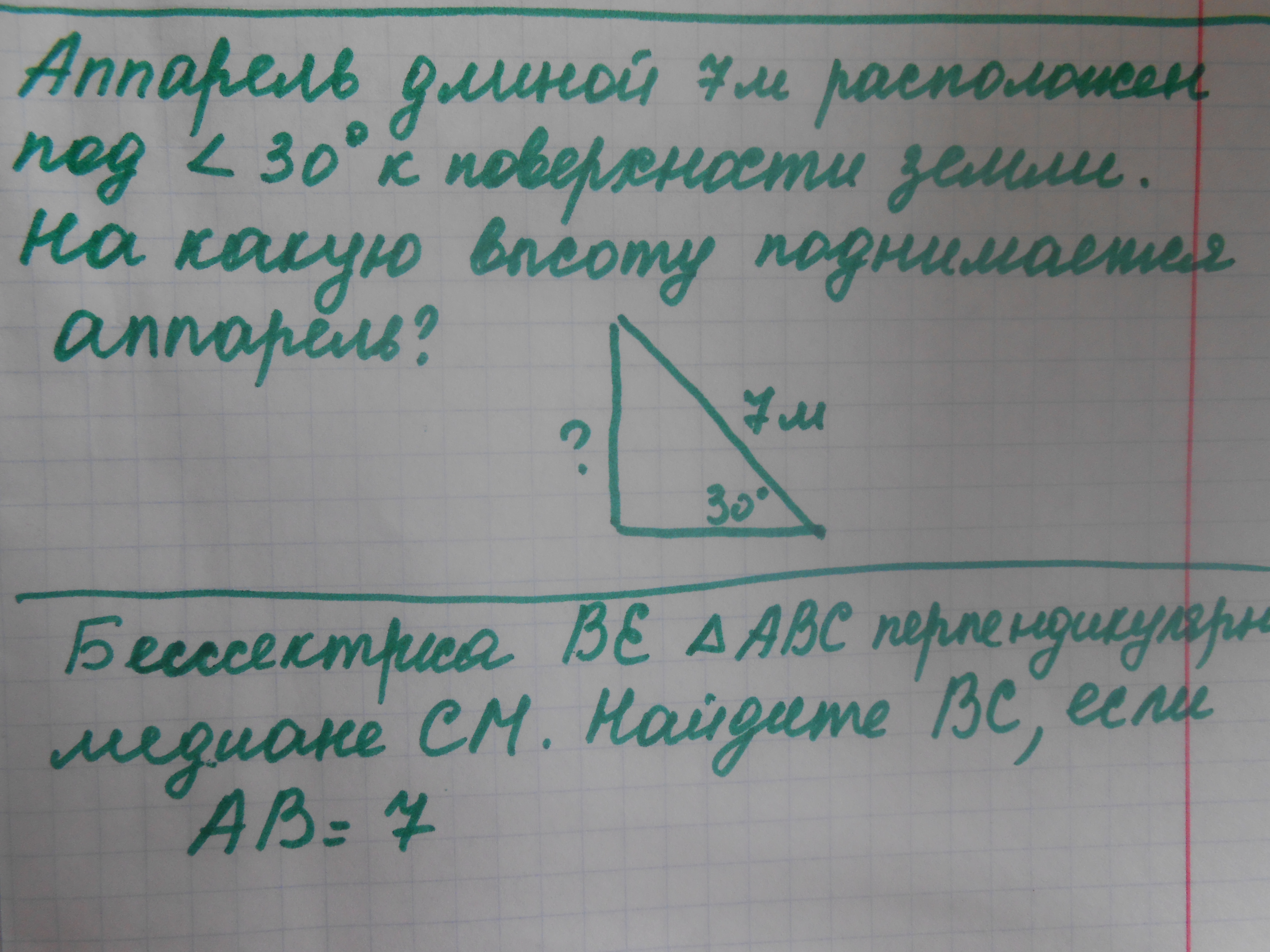 Смотри, у тебя прямоугольный треугольник, а катет, лежащий против угла в 30°= половине гипотенузы). Значит, равен 3,5