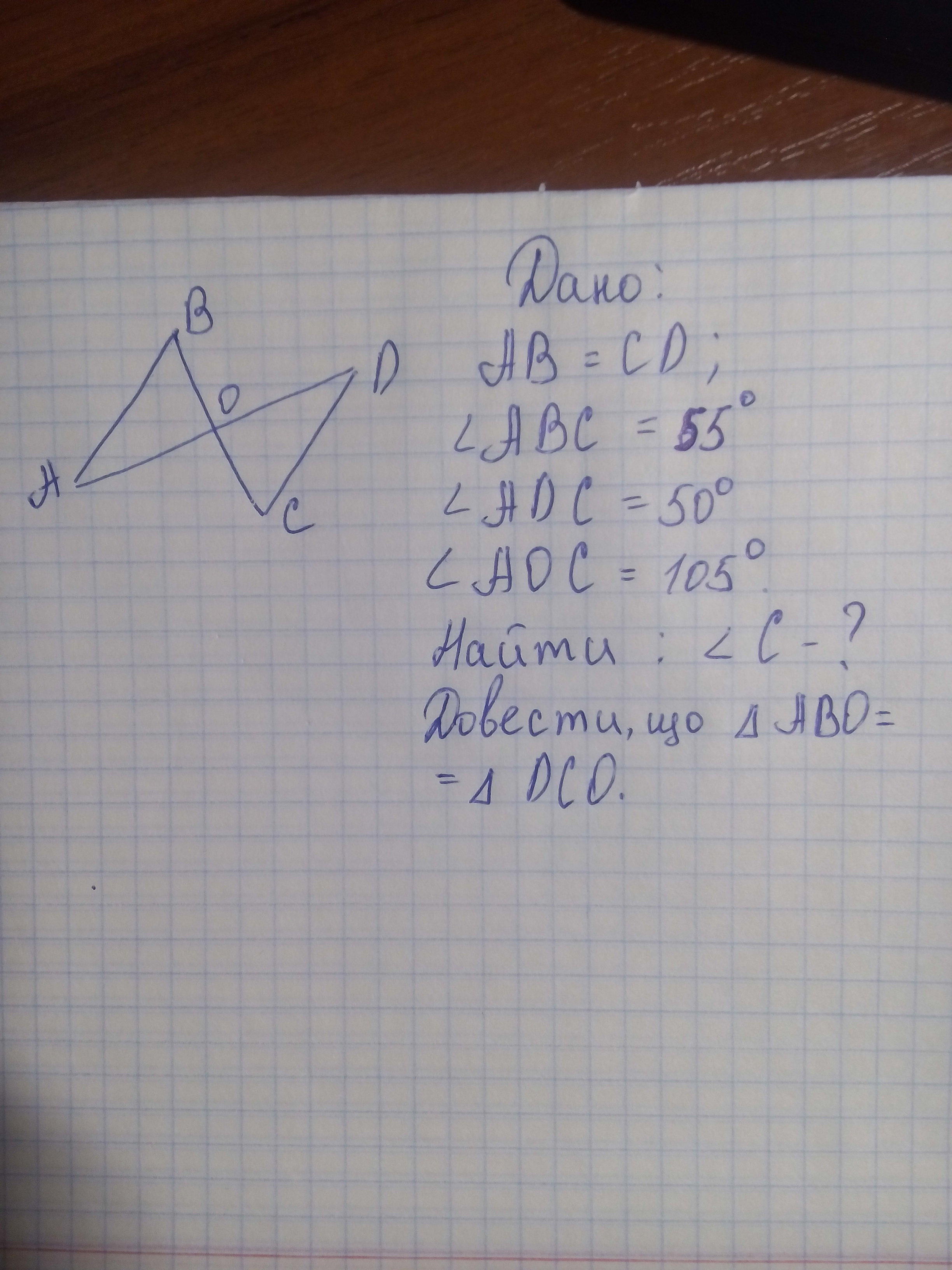 На рисунку АВ=СД,кут АВС=55 градусів ,кут АДС=50 градусів , кут АОС = 105 градусів . Знайти кут С ,Довести ,що квадрат АВО=трикутнику ДСО