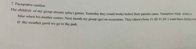The cilcdren of my group have already played games. Yesterday they were reading books before their parents came. Tomorrow Nick will riding a bike when his mother comes. Next month my group will go on excursions. They were drawing from 11 till 11.30. I want them will help me.