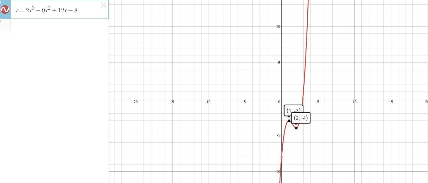 y''(1)=12-18=-6<0, в точке х=1 функция имеет максимум y(1)=2-9+12-8=-3