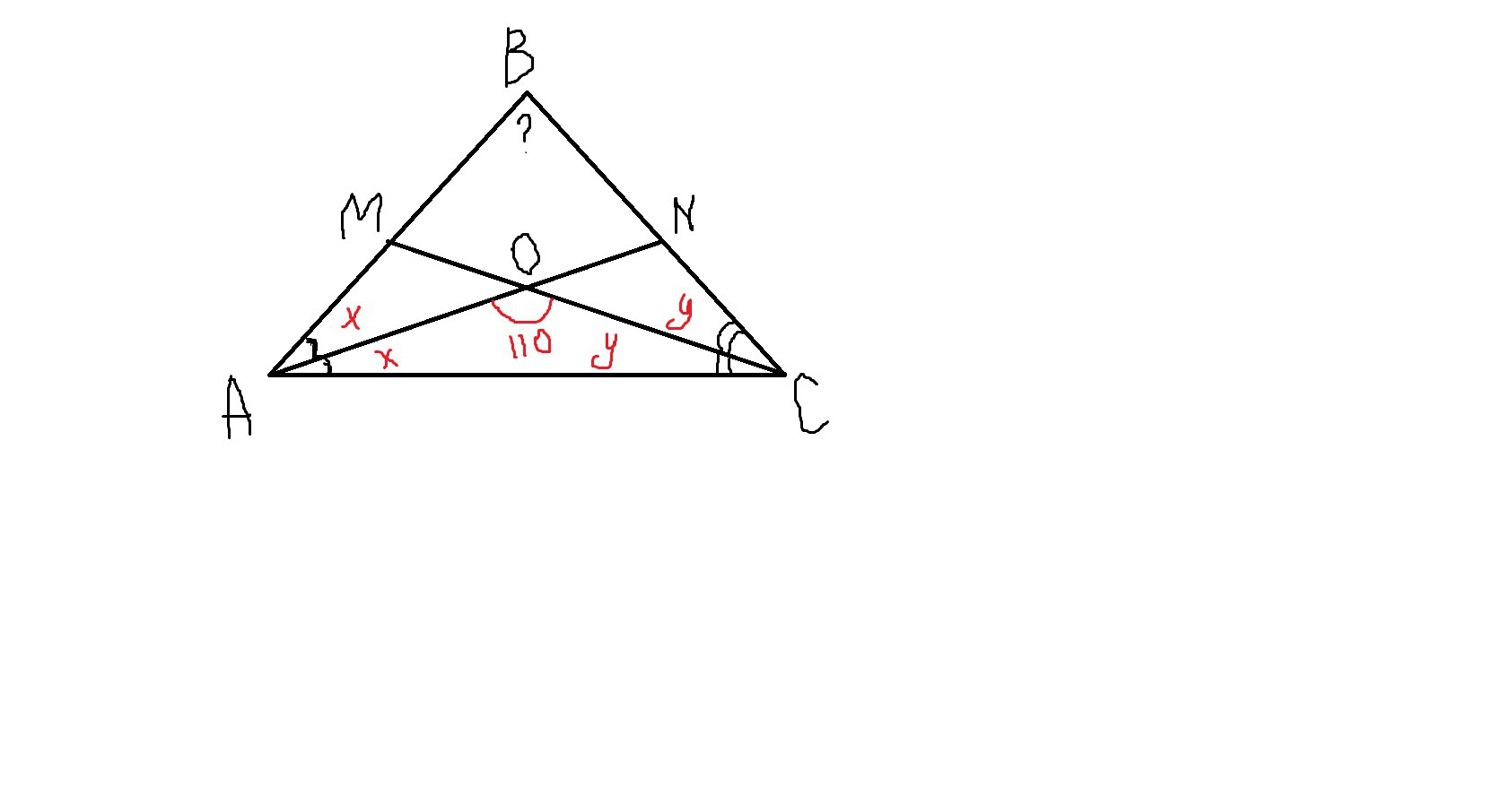 пусть угол ОАС будет- х, а угол ОСА- у, тогда рассмотрим треугольник АОС, угол при вершине равен 110, следовательно сумма углов при основании должна равняться 70, т.к из углов А и С проведены биссектрисы, возьмем их за АN и СМ, то углы ВАС будет равен- 2х, а угол ВСА- 2у. Сумма этих углов должна равняться 140, следовательно угол АВС= 180-140=40