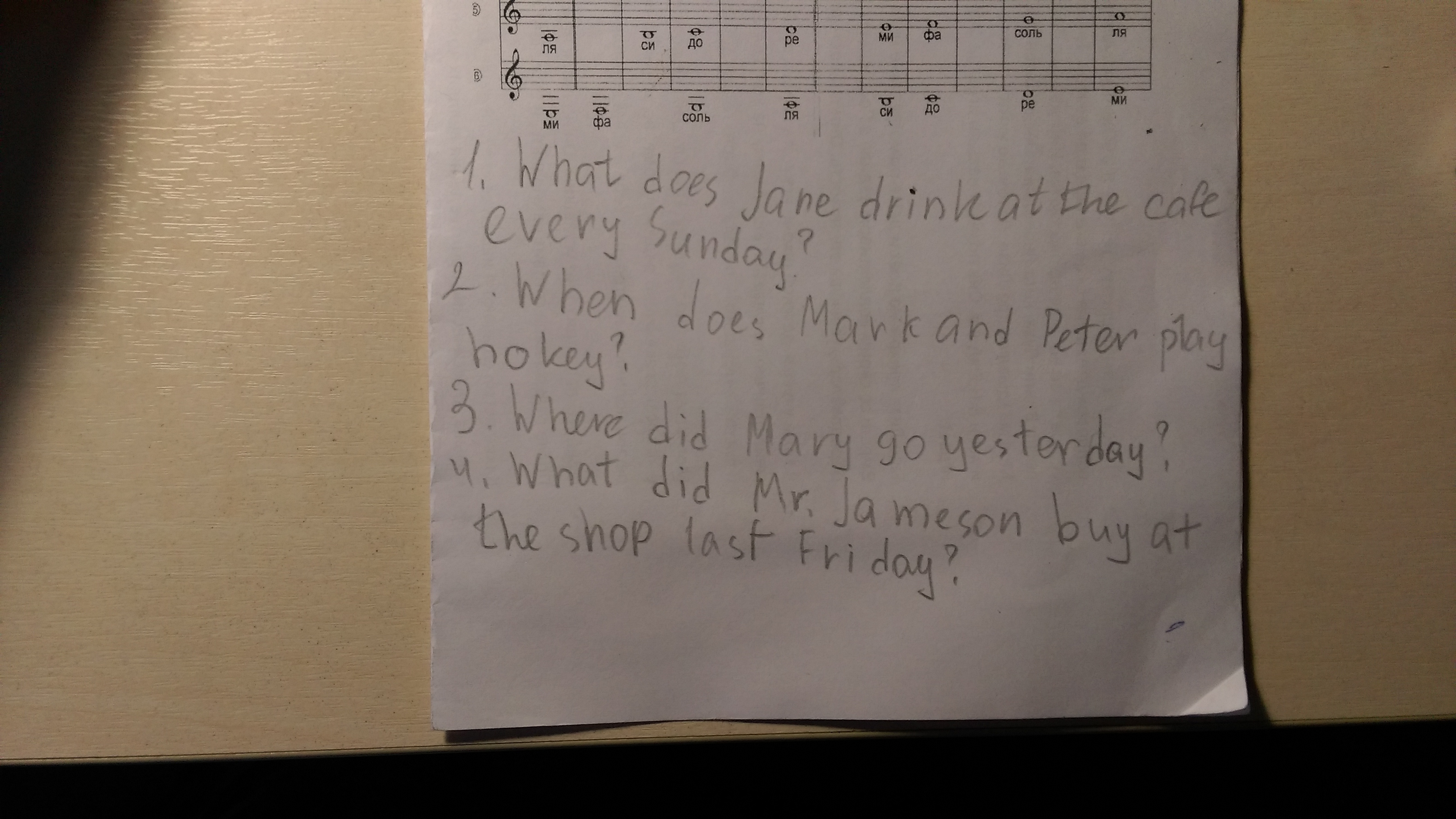 Составте вопросы на английском,пожалуйста Jane drinks orange juice at the cafe every Sunday.(9) Mark and Peter play hockey every winter.(7) Mary went to the park yesterday. (7) Mister Jameson bought 2 packets of cereal at the shop last Friday.(9) Пожалуйста нужно ооочень срочнооо