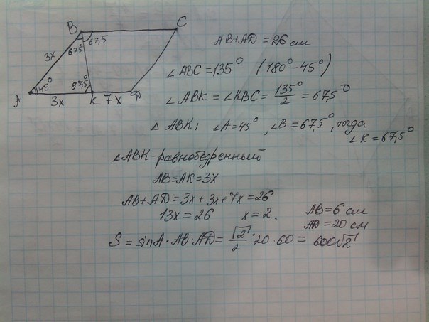 биссектриса тупого угла параллелограмма делит его сторону в отношении 3 : 7, считая от вершины острого угла, 45градусов. Вычислить площадь параллелограмма, если его периметр равен 52см