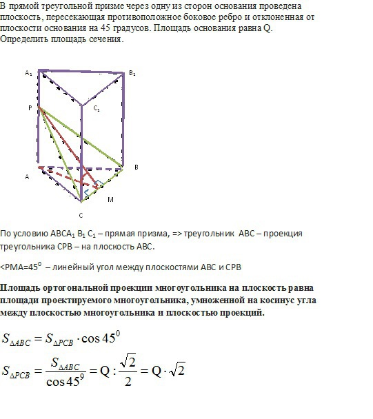В прямой треугольной призме через одну из сторон основания проведена плоскость, пересекающая противоположное боковое ребро и отклоненная от плоскости основания на 45 градусов. Площадь основания равна Q. Определить площадь сечения.