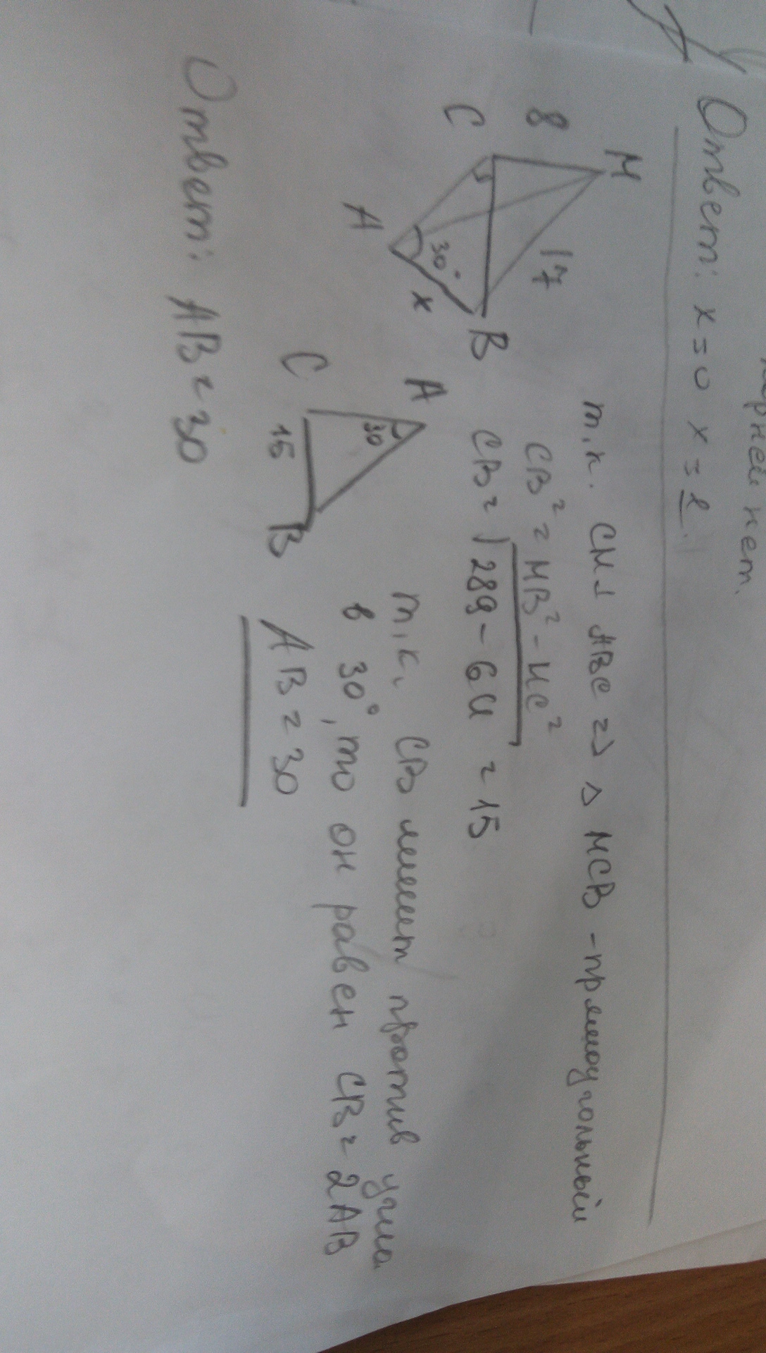 Через вершину прямого угла С прямоугольного треугольника АВС к его плоскости проведен перпендикуляр СМ. Найдите длину стороны АВ треугольника АВС, если СМ = 8 см, ВМ = 17см, кутСАВ = 30 градусов