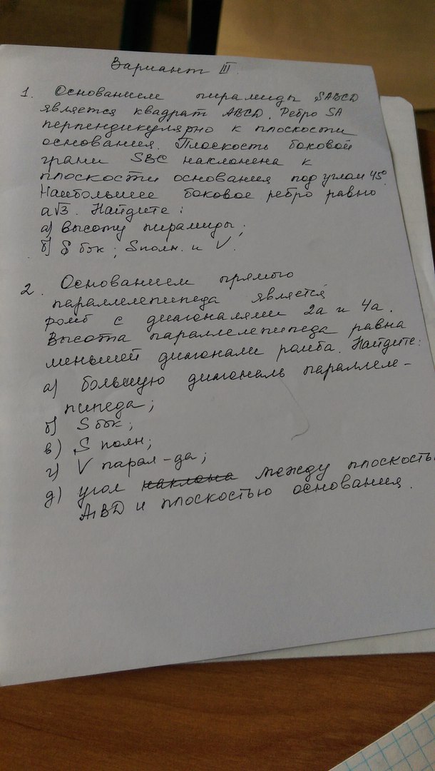 1) Основанием пирамиды SABCD является квадрат ADCD. Ребро SA перпендикулярно к основанию. Плоскость боковой грани SBC наклонена к основанию под 45 градусов. SC=a(корень из)2 . Найти высоту, объем, площадь пирамиды.