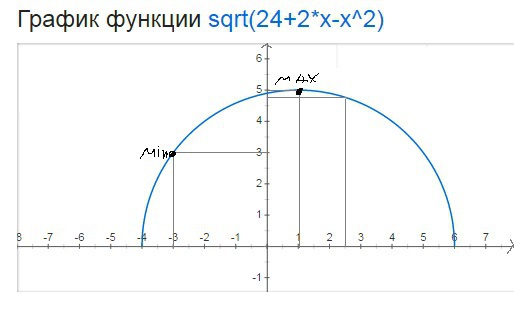 y=√(24+2x-x²)=√(24+1-1+2x-x²)=√(25-(x²-2x+1))=√(25-(x-1)²)