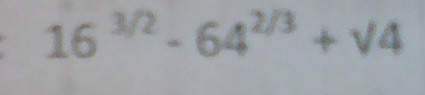 16^(3/2)-64^(2/3)+sqrt(4)=(2^4)^(3/2)-(2^6)^(2/3)+2=2^6-2^4+2=64-16+2=50