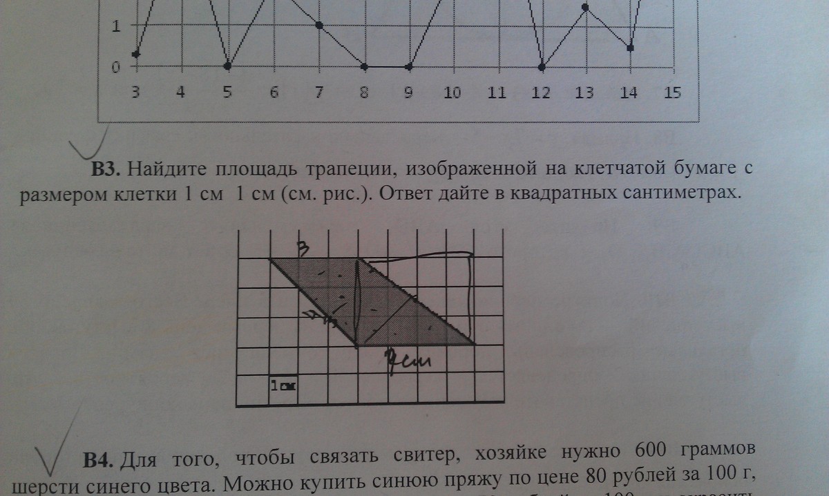 Найдите площадь трапеции, изображенной на клетчатой бумаге с размером клетки 1см 1см(см.рис). Ответ дайте в квадратных сантиметрах.