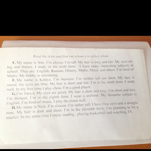 3) Я Таня. У меня зелёные глаза. Мои волосы тёмные и длинные. Я короткая и худая. Мне 13. Я учусь в 8. Я ношу униформу. Мой любимый предмет Английский. Я люблю музыку. Я хорошо играю на пианино.