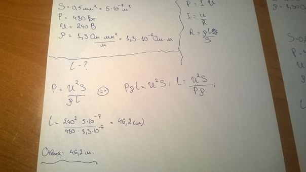 Сколько метров фехралевой проволоки площадью поперечного сечения 0,5мм² потребуется для намотки электродвигателя мощностью 480Вт, рассчитанного на напряжение 240В?(Удельное сопротивление фераля 1,30м*мм²/м