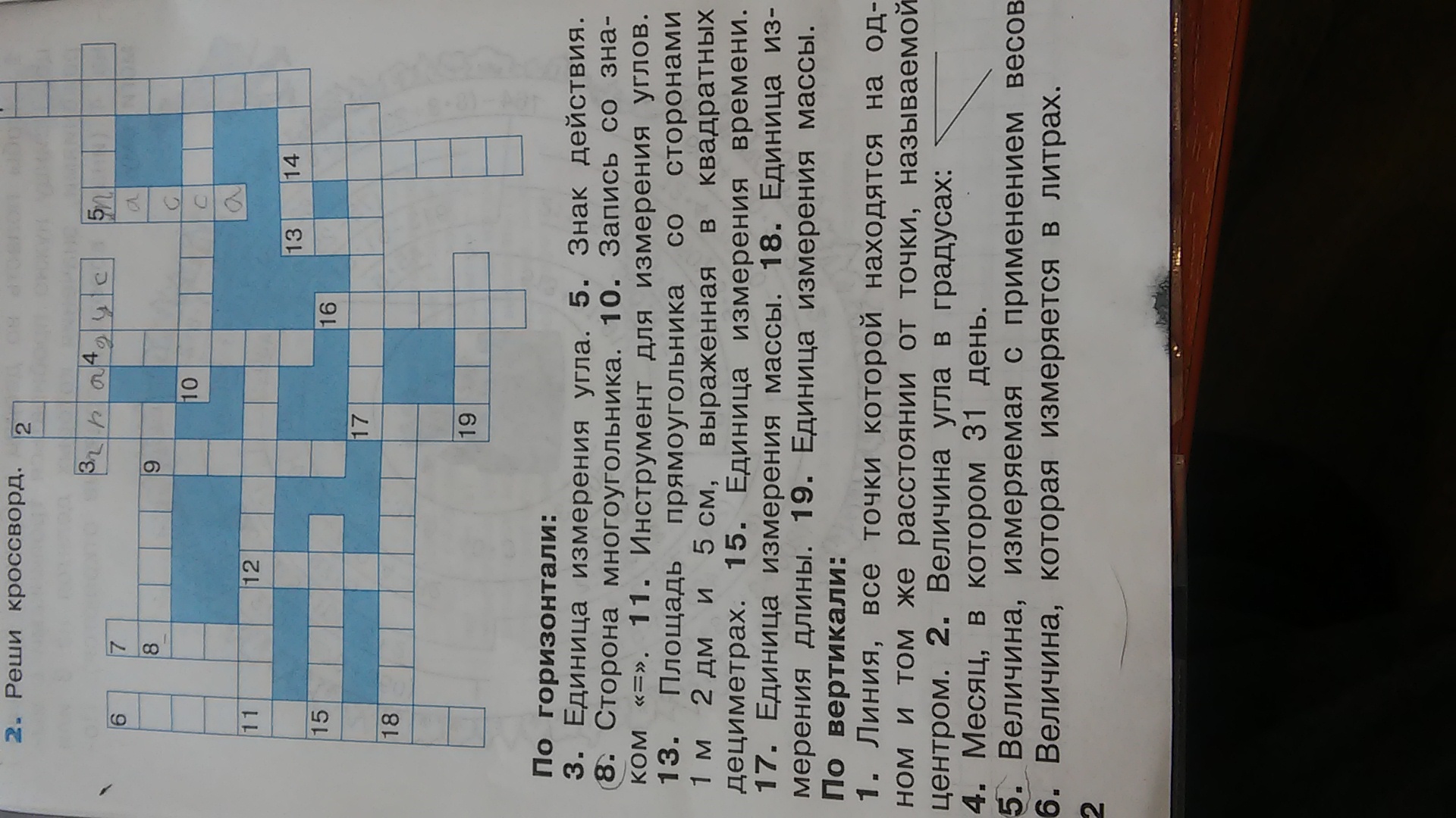 1. Окружность 2.сорок 4.декабрь 6.вместимость 8. Отрезок 10. Равенство 11.транспортир 13. Шесть 15. Минута 17килограмм 18.сантиметр 19.грамм