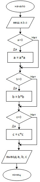 Нарисуйте пожалуйста блок-схему, задача с ветвлениями! Даны три действительных числа. Возвести в квадрат те из них которые не отрицательные.