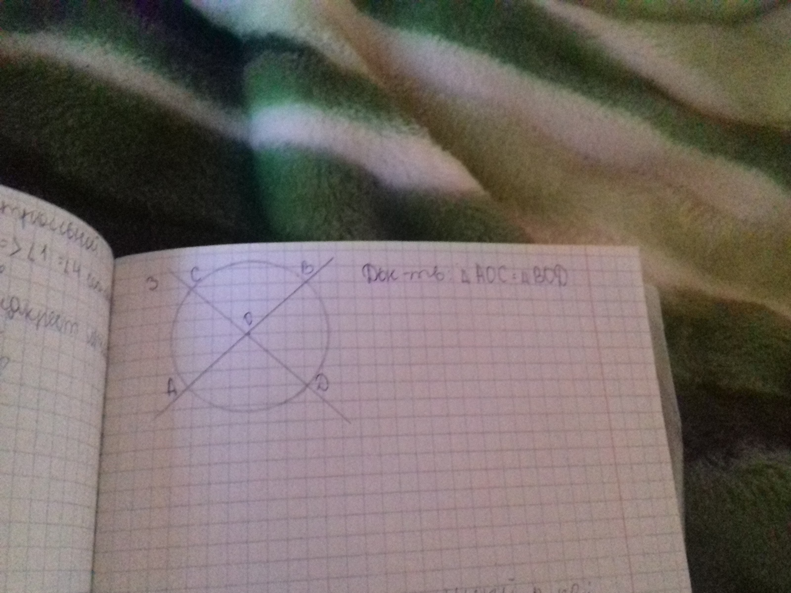 Смотри, угол AOC=COB, т.к. вертикальные углы. Т.к. эти треугольники находятся в окружности и их стороны выходят из точки О, т.е. из центра, то AO=OC=OB=OD - радиусы данной окружности.По первому признаку равенства треугольников они равны (две стороны и угол между ними)