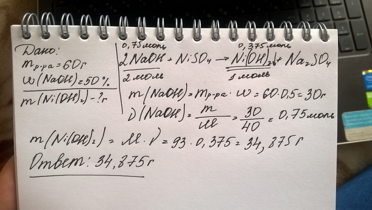 Вычислите массу осадка, который получится при взаимодействии 60 г. гидроксида натрия (NaOH) с массовой долей 50% с избытком раствора NiSo4