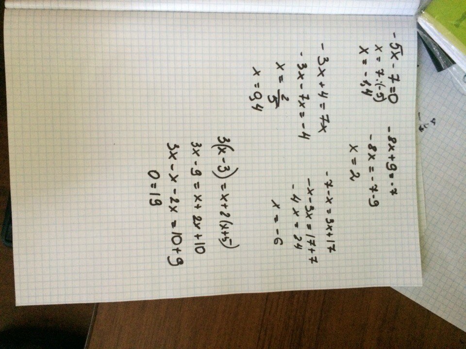 1) -5x-7=0. 2) -8x+9=-7. 3) -3x+4=7x. 4) -7-x=3x+17. 5) 3(x-3)=x+2(x+5). РЕШИТЕ ПОЖАЛУЙСТА С РЕШЕНИЯМИ СРОЧНО