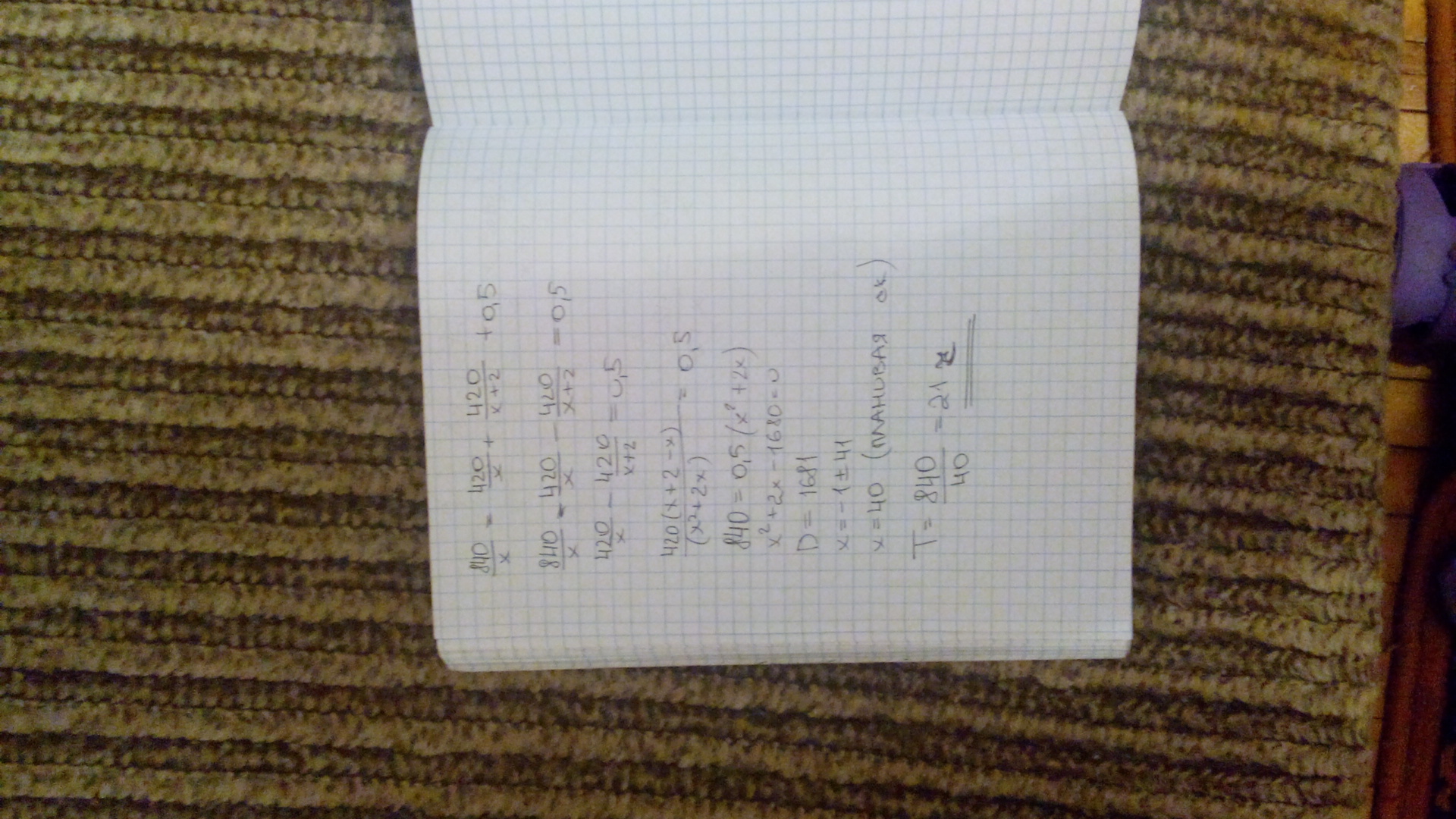 Поезд должен был пройти 840 км в определенное время. На половине пути поезд был задержан у семафора на 1/2 часа и, для того, чтобы прийти к месту назначения в срок, увеличил скорость на 2 км/ч. Сколько времени поезд находился в пути?