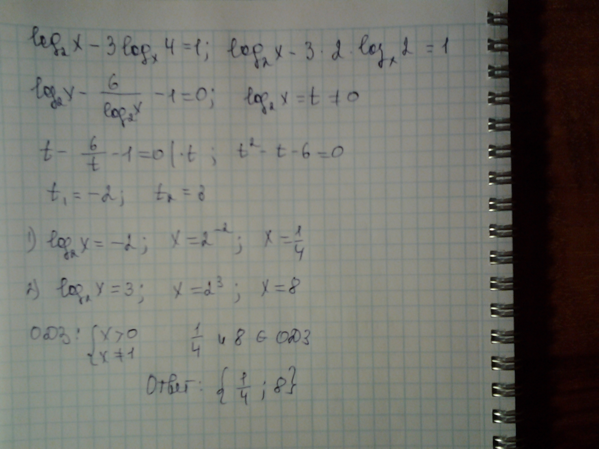Применены свойства логарифмов, замена переменной
