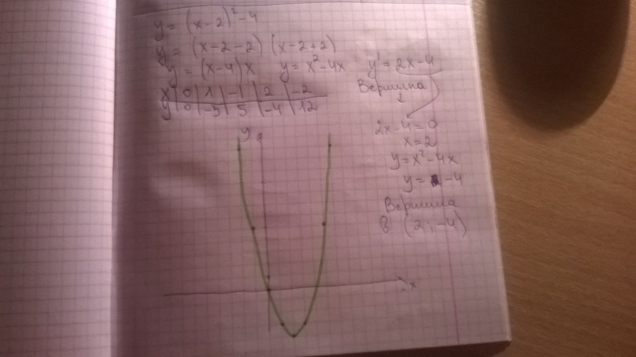 Сначала преобразуем. Потом находим производную. Затем приравниваем ее к нулю, дабы найти вершину. Получившийся Х подставляем в исходное, находим игрик. Эта точка вершины. Затем просто подставляем значения (любые, которые удобно считать)