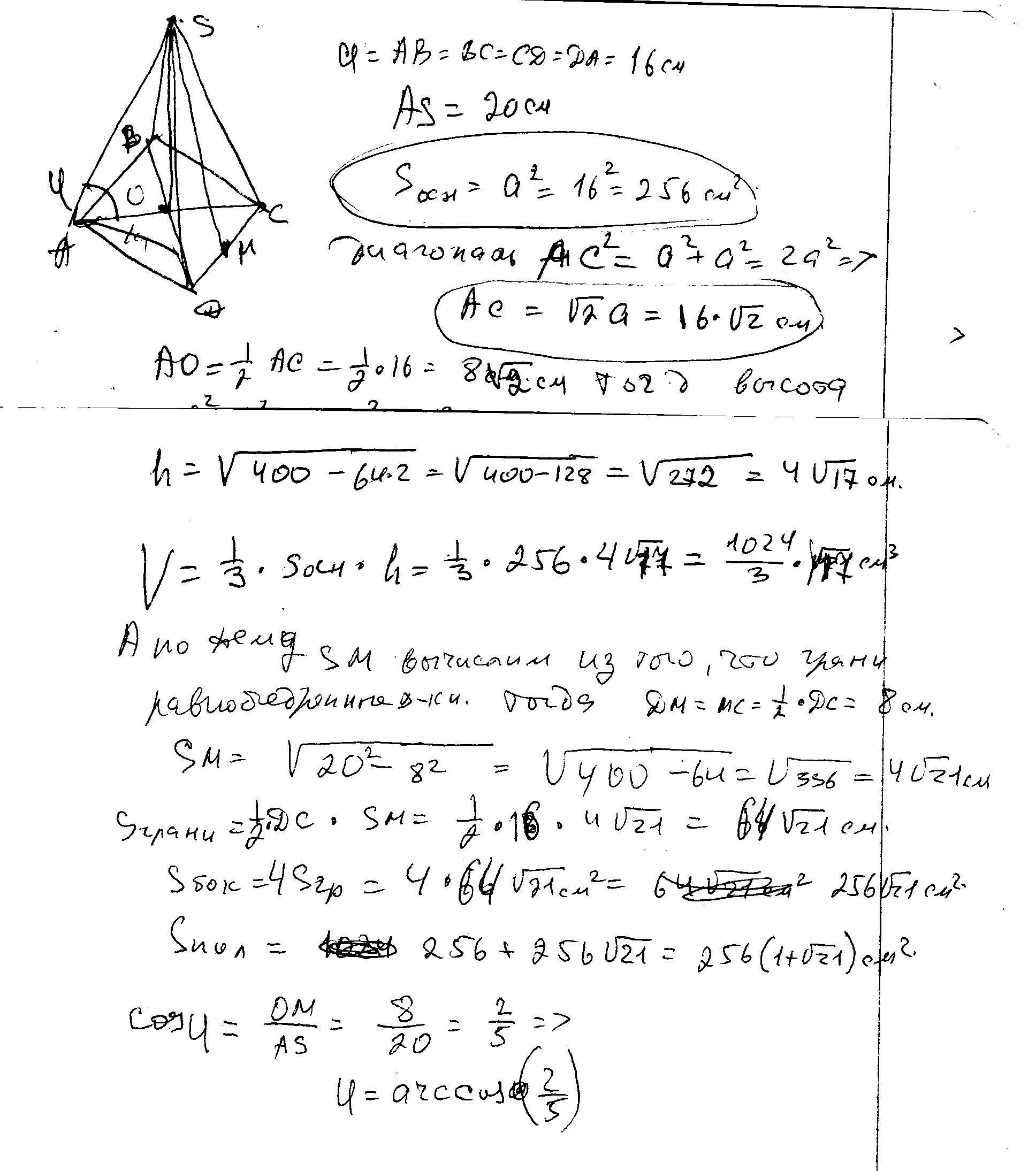 Дана правильная пирамида в основании квадрат со сторонами 16см, АВ=16, АS=20см. Найдите объём пирамиды, Sполное и угол между боковой гранью и основанием. Помогите пожалуйста, надеюсь на вас.