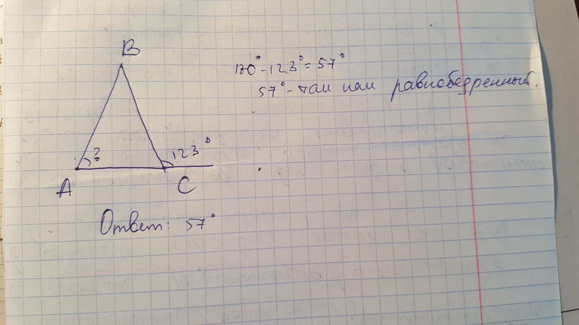 в равнобедренном треугольнике АВС с основанием АС внешний угол при вершине С равен 123 градусов.найдите величину угла ВАС.