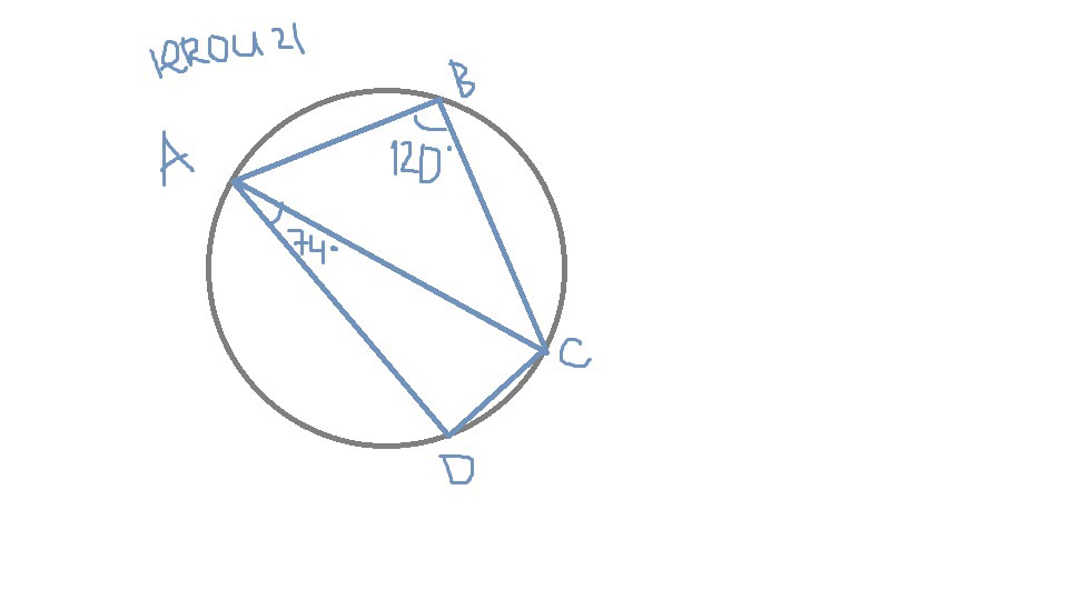 Четырехугольник АВСD вписан в окружность. Угол АВС равен 120°, угол САD равен 74°. Найдите угол АВD.