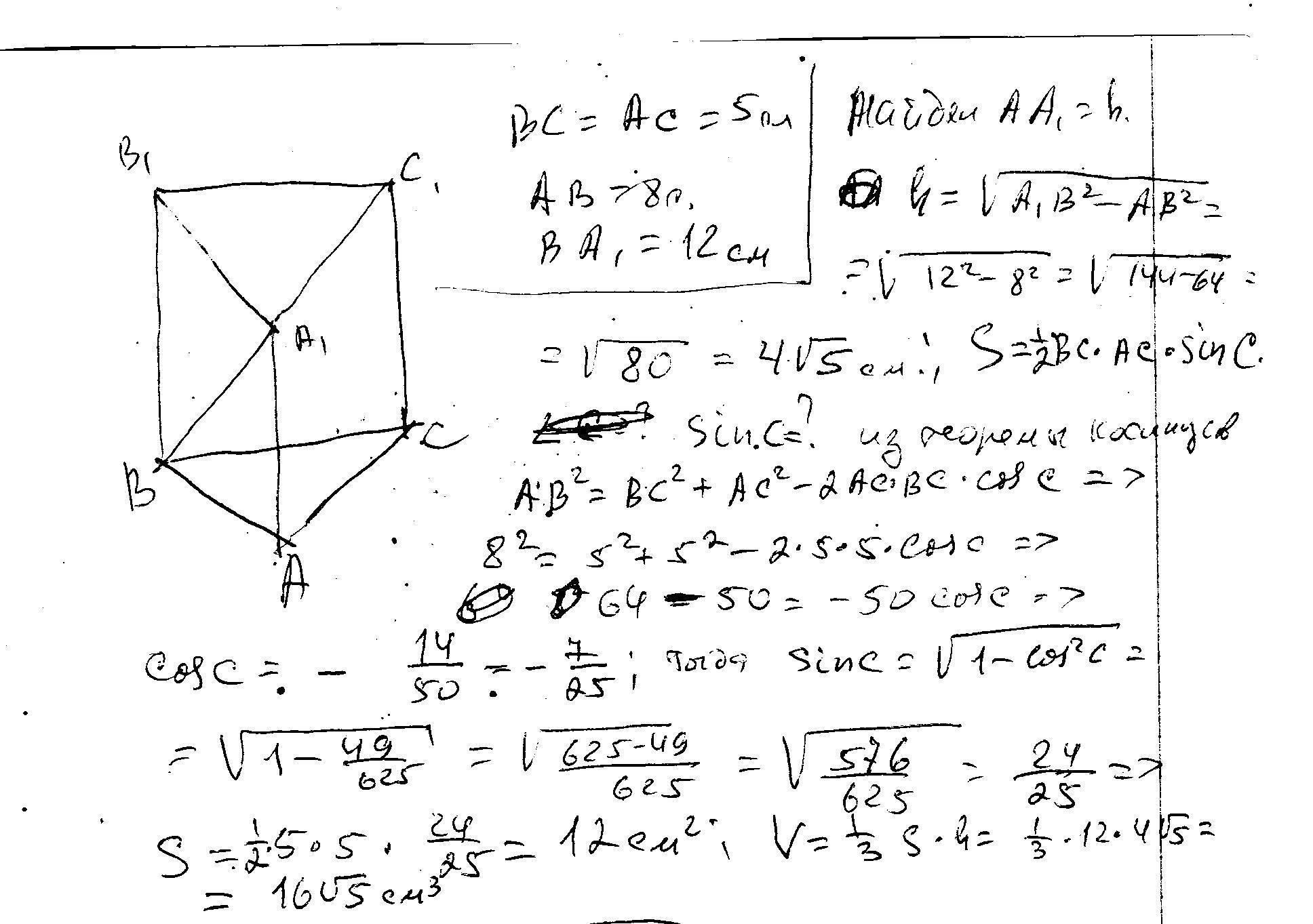 В основании прямой призмы лежит равнобедренный треугольник со сторонами 5, 5 и 8 см.