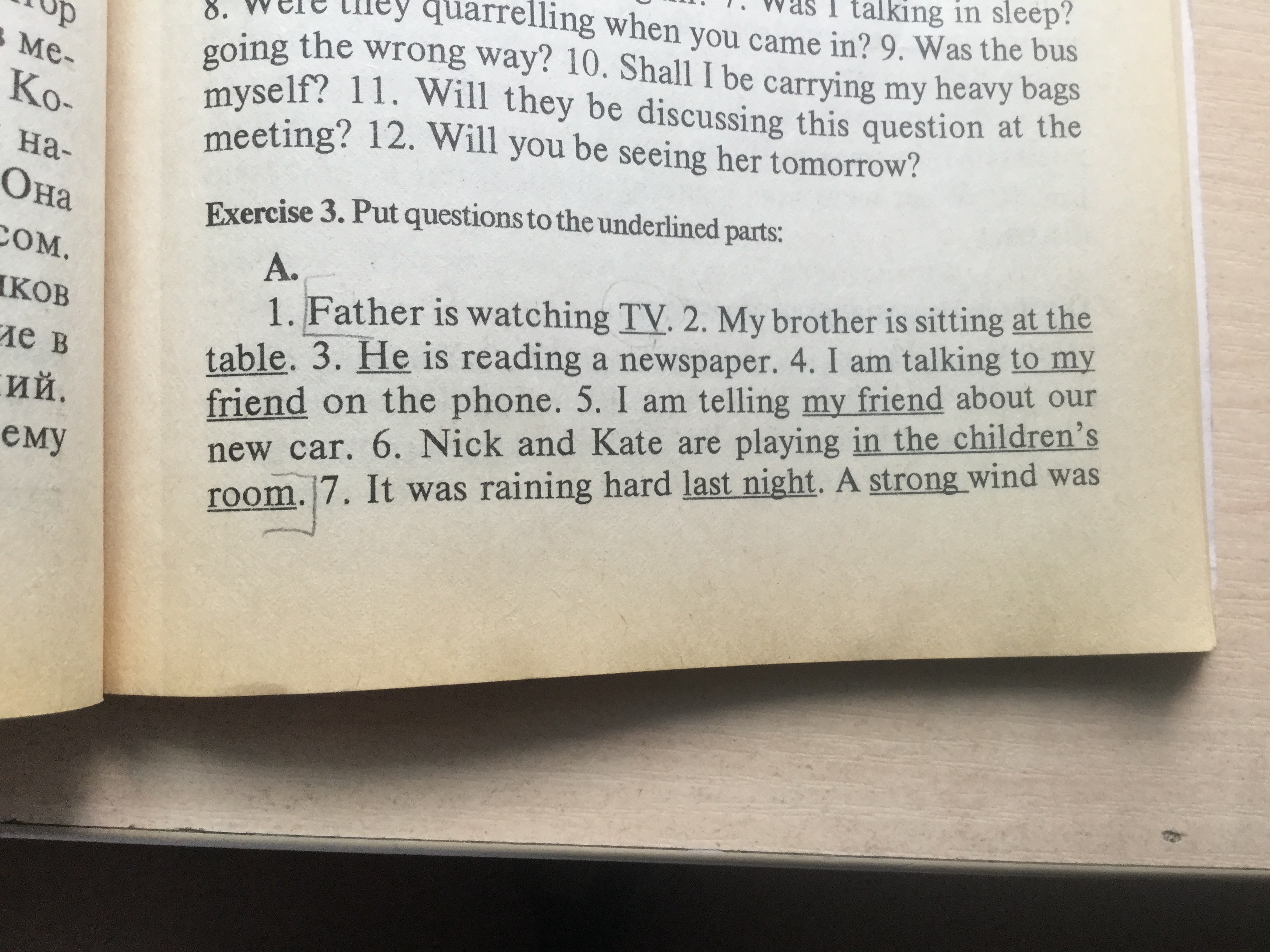 1. What is father watching now? 2. Where is my brother sitting? 3. Who is reading a newspaper. 4. Who am I talking to? Who am I telling about our new car? 6. Where are Nick and Kate playing? 7. When was it raining?