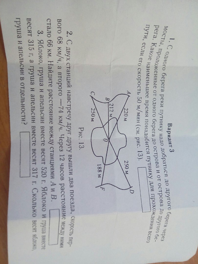С одного берега реки путнику надо добраться до другого берега через мосты проложенные от одного берега до острова и от острова до другого берега.Какое наименьшее время понадобится путнику для прохождения всего пути,если его скорость 50м/мин и вот рисунок..