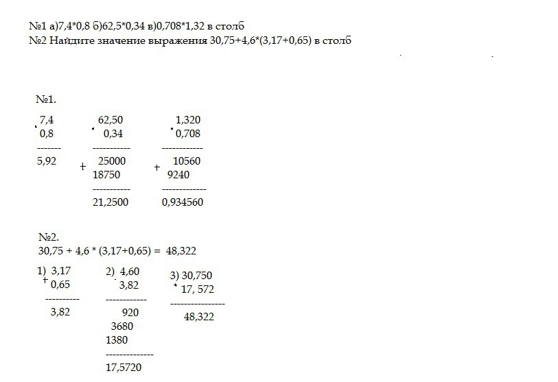 Выполните умножение а)7,4*0,8 б)62,5*0,34 в)0,708*1,32 в столб