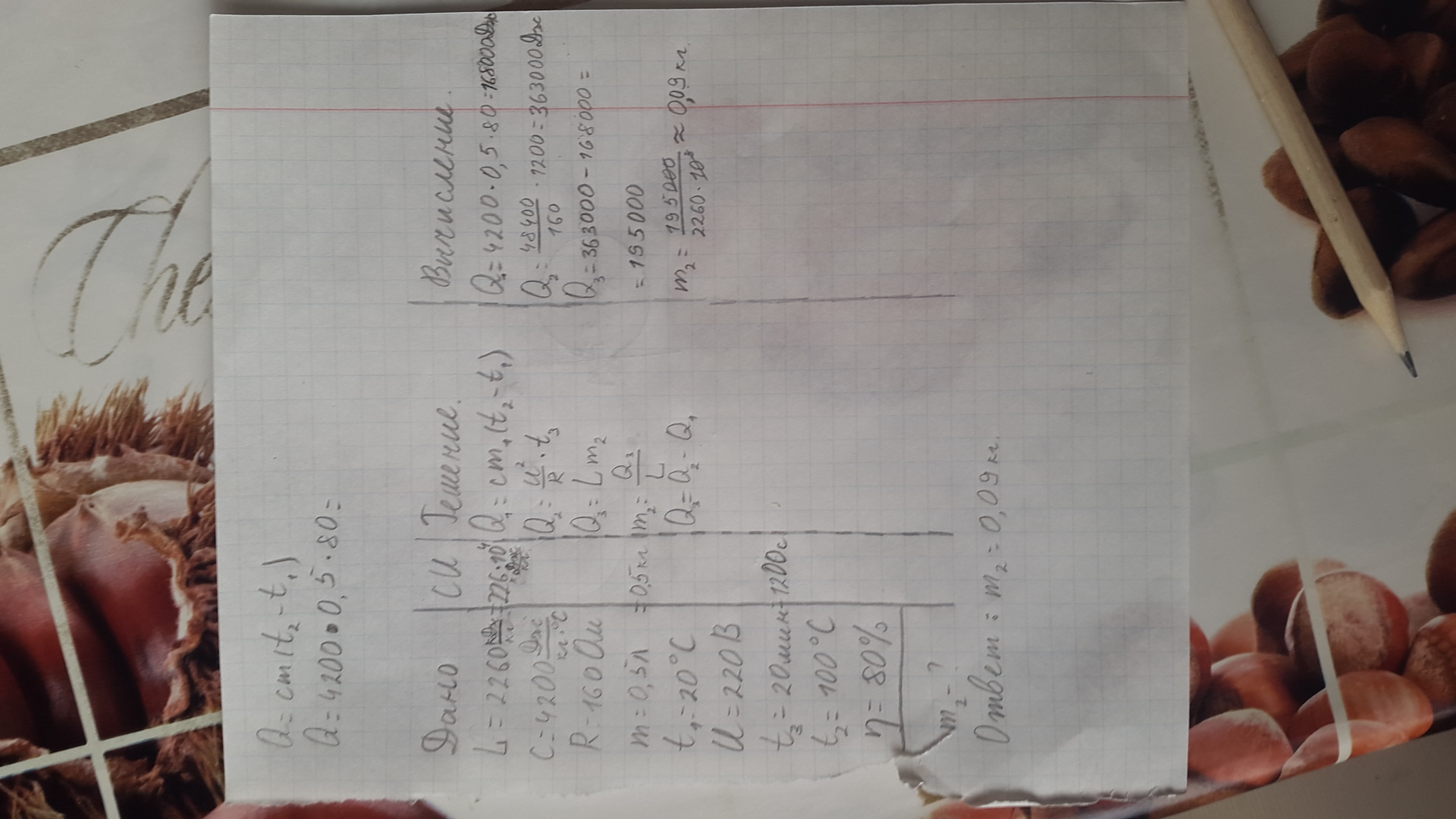 Электрокипятильник со спиралью сопротивлением 160 Ом поместили в сосуд, содержащий 0,5 л воды при 20 °С, и включили в сеть напряжением 220 В. Через 20 минут спираль выключили. Какое количество воды выкипело, если КПД спирали 80%?