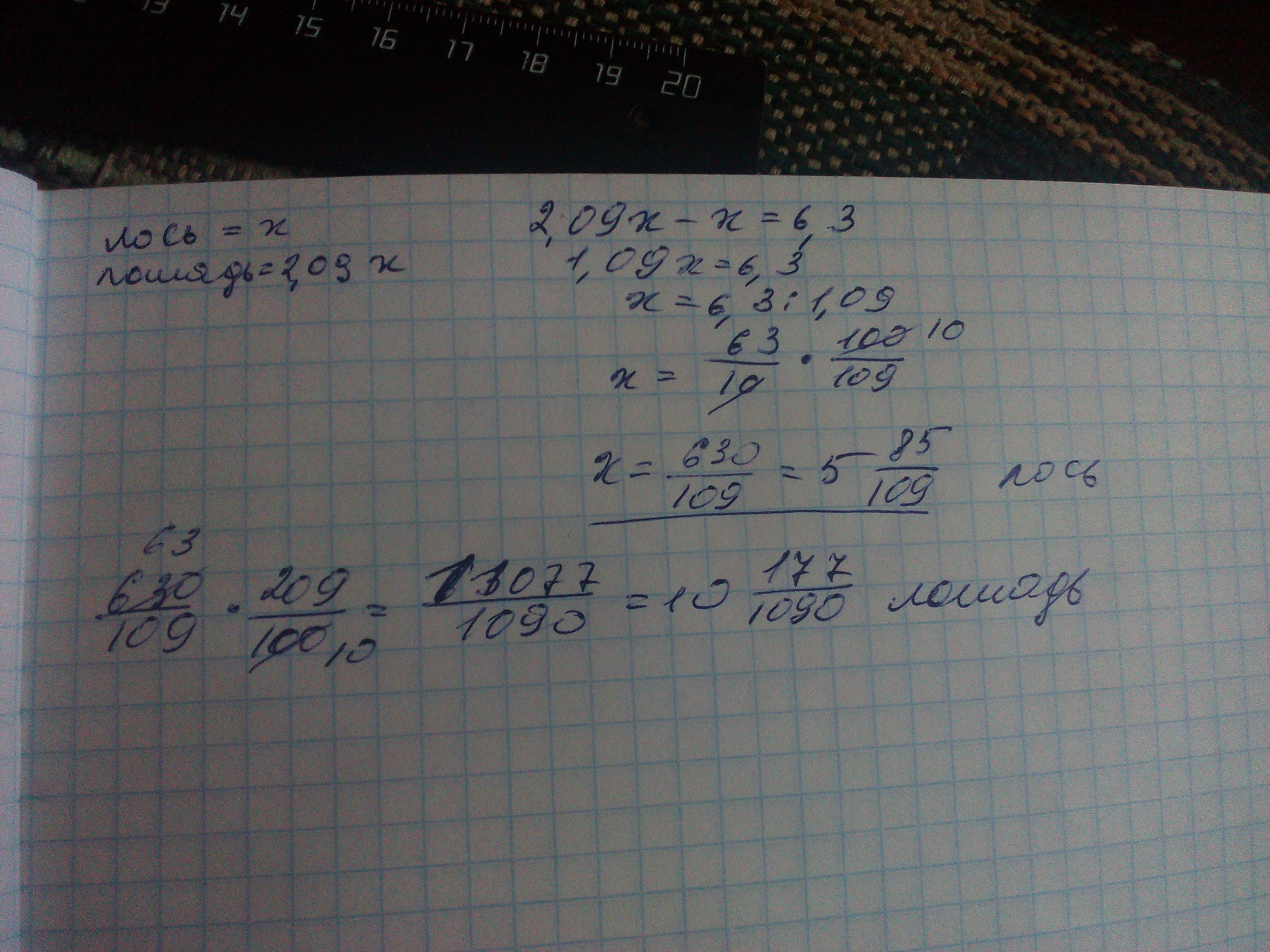 Скорость лошади в 2,09 раза больше скорости лося. Какова скорость лошади каждого животного , если скорость лося на 6,3 кмч меньше скорости лошади?