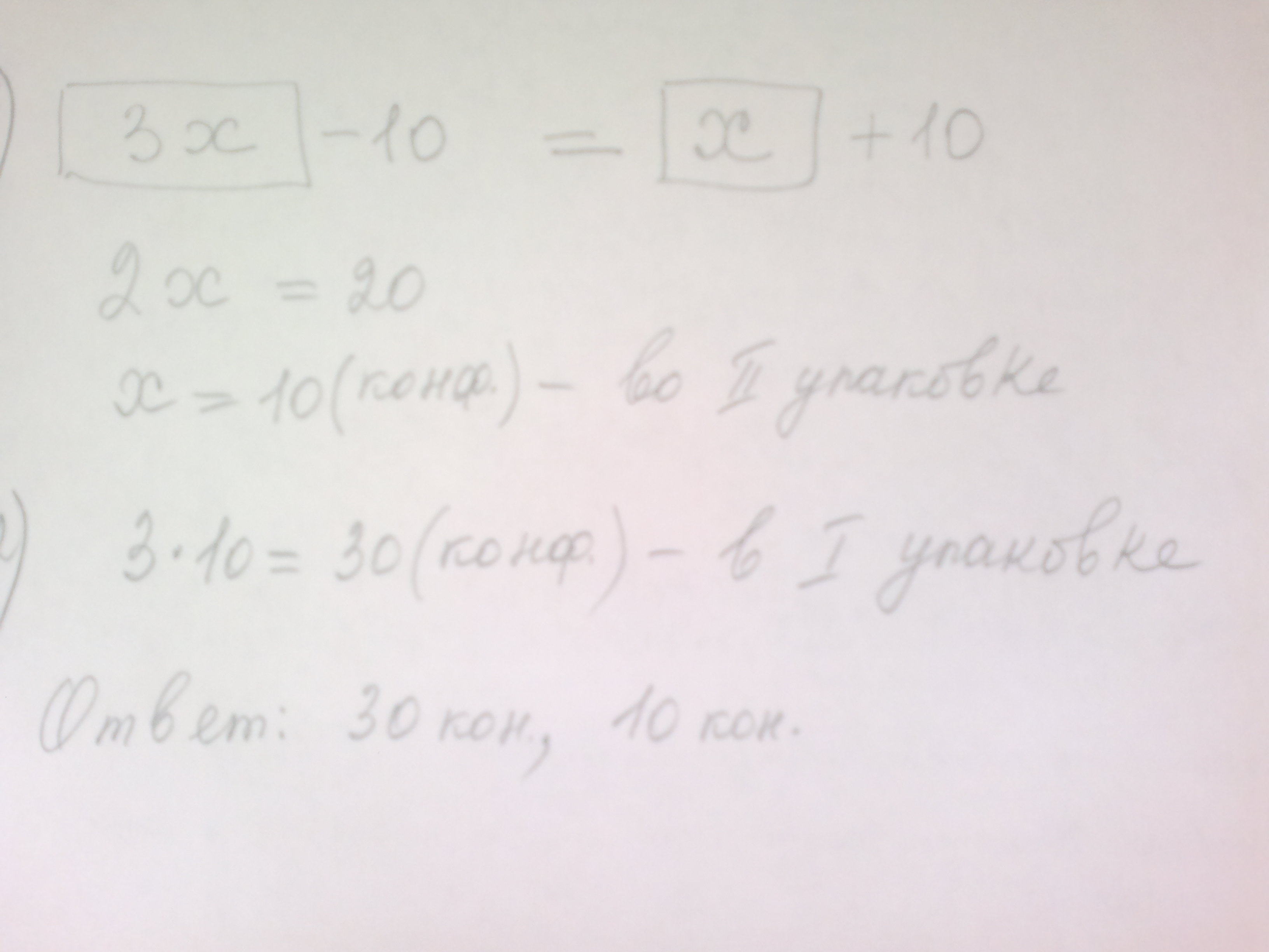 6 класс Одна упаковка конфет в 3 раза больше второй . Если с первой упаковки выложить 10 конфет во второй тогда они будут равны Сколько конфет в каждом из упаковок первоначально