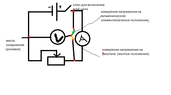 нАчЕрТиТе СхЕмУ эЛеКтРиЧеСкОй ЦеПи, СоСтОяЩеЙ иЗ гАлЬвАнИчЕсКоГо ЭлЕмЕнТа, КлЮчА, рЕоСтАтА, аМпЕрМеТрА и ВоЛьТмЕтРа, ПоДкЛюЧёНнОгО тАк, ЧтОбЫ, нЕ мЕнЯя ТоЧеК еГо ПрИсОеДиНеНиЯ, иМ мОжНо БыЛо Бы ПоОчЕрЁдНо ИзМеРяТь НаПрЯжЕнИе На ГаЛьВаНиЧеСкОм ЭлЕмЕнТе И нА рЕоСтАтЕ (нАпРяЖеНиЕ нА аМпЕрМеТрЕ, кЛюЧе И сОеДиНиТеЛьНыХ пРоВоДаХ нЕ уЧиТыВаЙтЕ). пРи КаКоМ пОлОжЕнИи КлЮчА вОлЬтМеТр БуДеТ пОкАзЫвАтЬ нАпРяЖеНиЕ нА гАлЬвАнИчЕсКоМ эЛеМеНтЕ, а ПрИ кАкОм-На РеОсТаТе? помогите пожалуйста