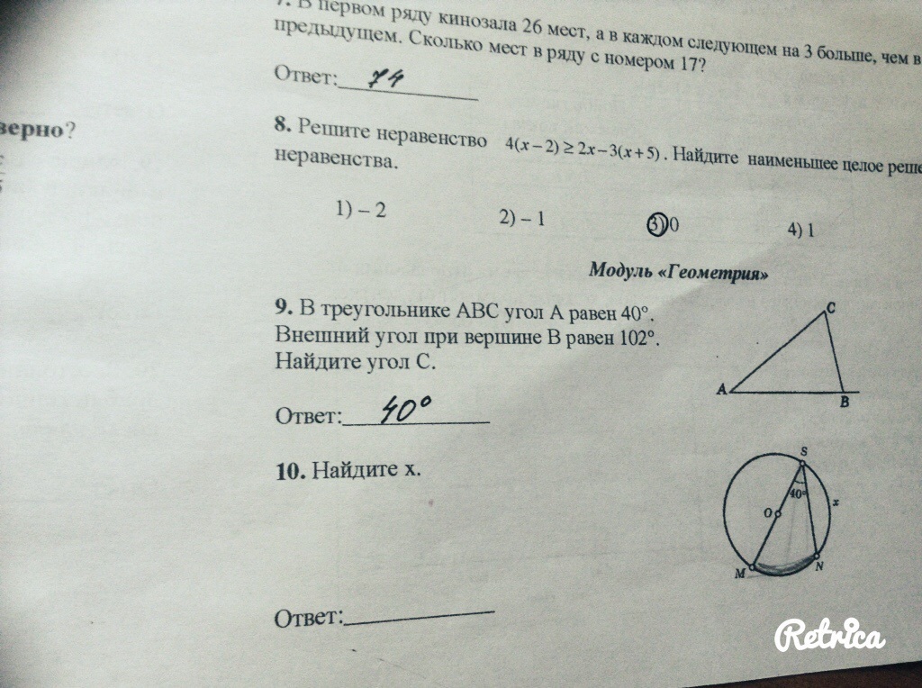Скорее всего, там нужно найти угол SON. Этот угол стягичает дуга Х. Так как SO=ON, то угол ONS = угол OSN, тогда Х