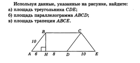Прежде чем вычислять площади указанных фигур, надо найти высоту этих фигур ( ВН) . Она у этих фигур одна и та же.