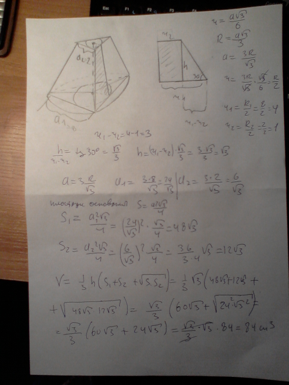в правильной треугольной усеченной пирамиде длины радиусов описанных около оснований окружностей равны 8 и 2 см, а боковые грани наклонены к плоскости большого основания под углом 30. Вычислить обьем пирамиды