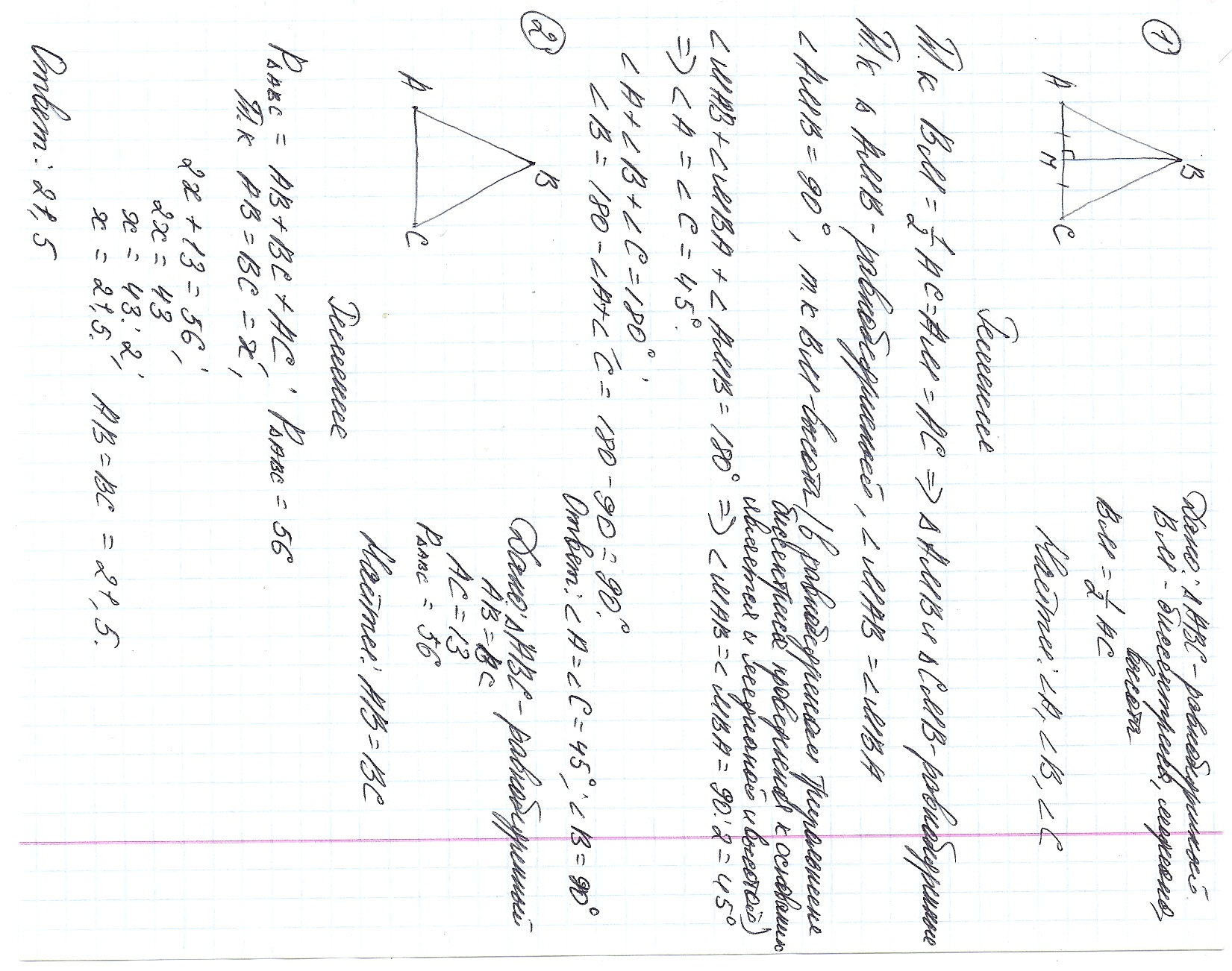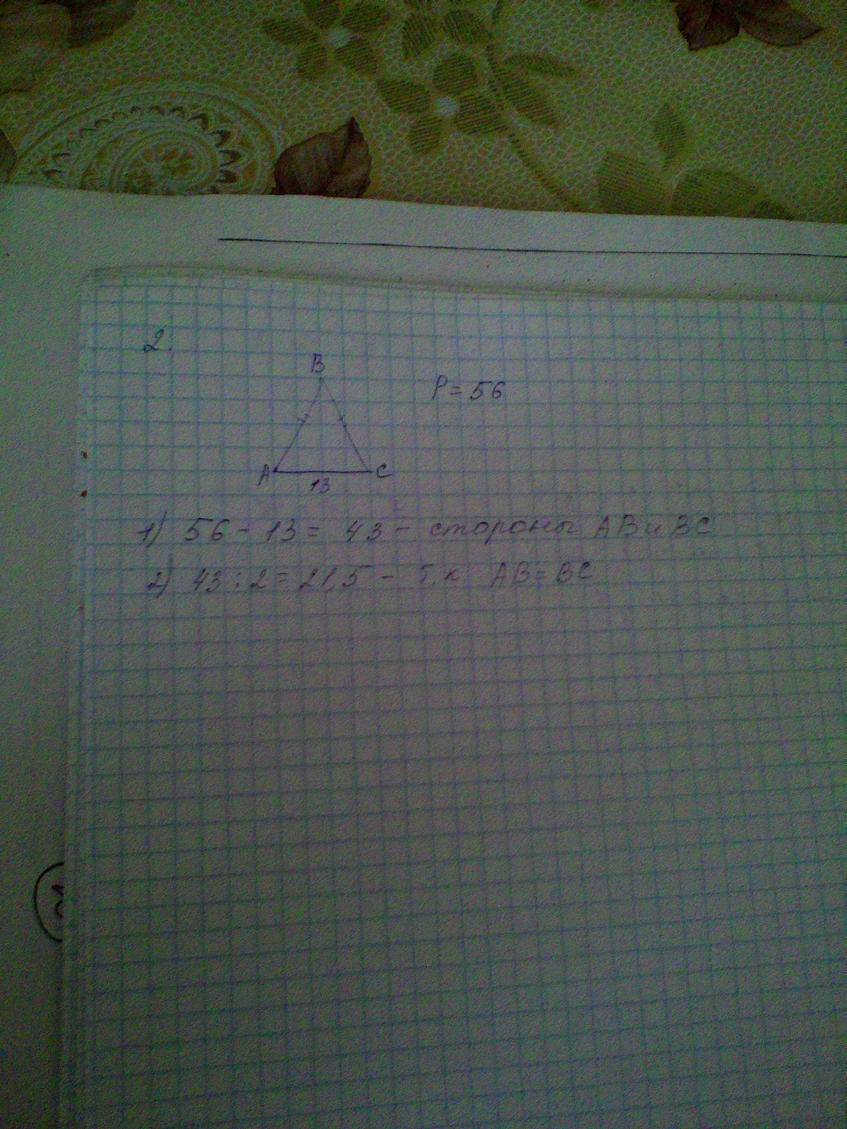 2.Вычислите длину боковых сторон равнобедренного треугольника. если его основание равно 13 см, а периметра этого треугольника равен 56 см.