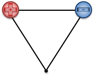 На рисунке указан равносторонний треугольник, в двух вершинах которого располагаются заряды, равные по модулю. Как будет направлен вектор напряженности электрического поля в третьей вершине треугольника?