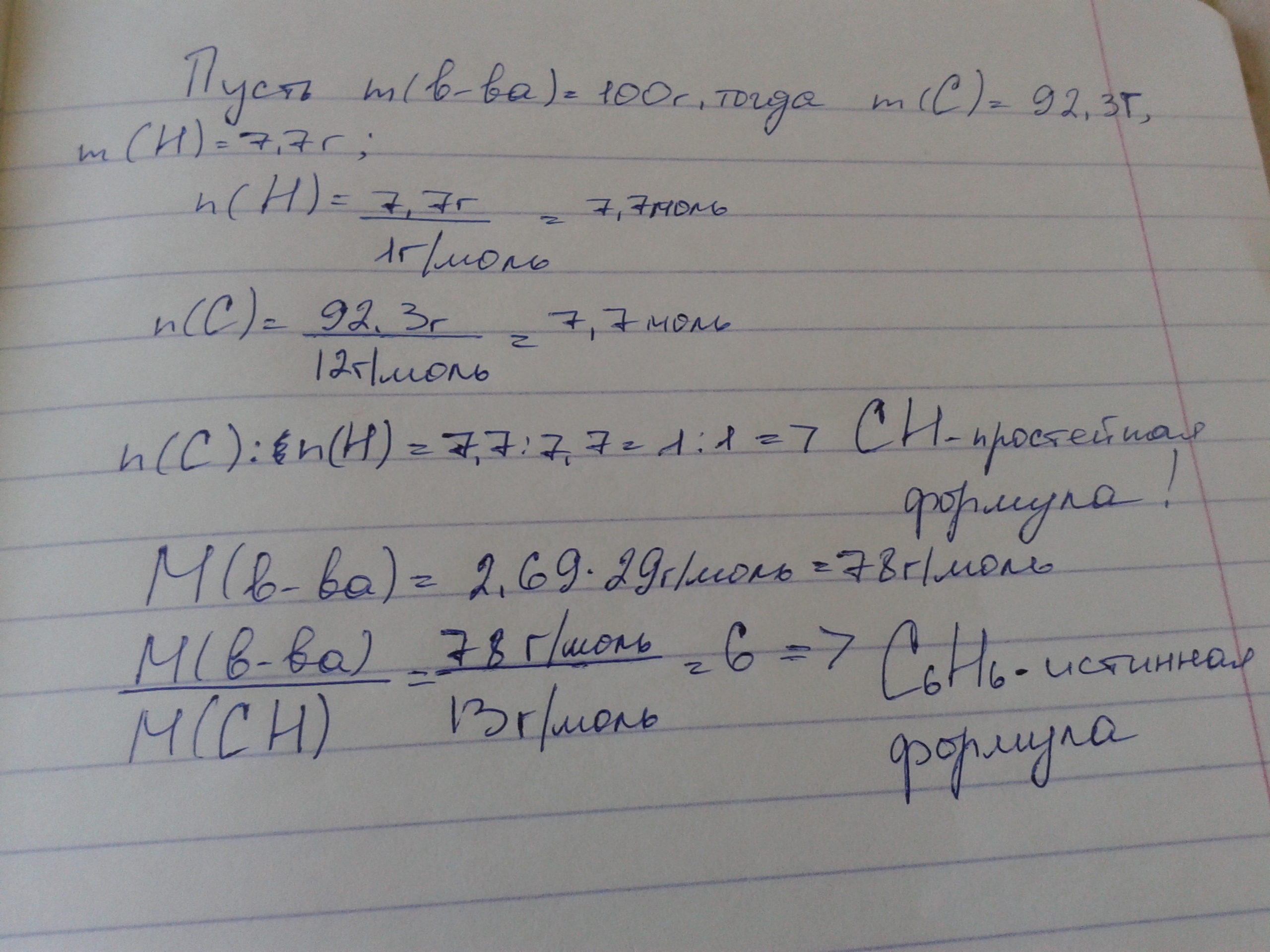 вывести молекулярную формулу вещества. Пж помогите. Массовая доля углеводорода 92, 3%, водорода 7, 7%. Относительнаяплотность паров этого вещ. по воздуху 2, 69. спс