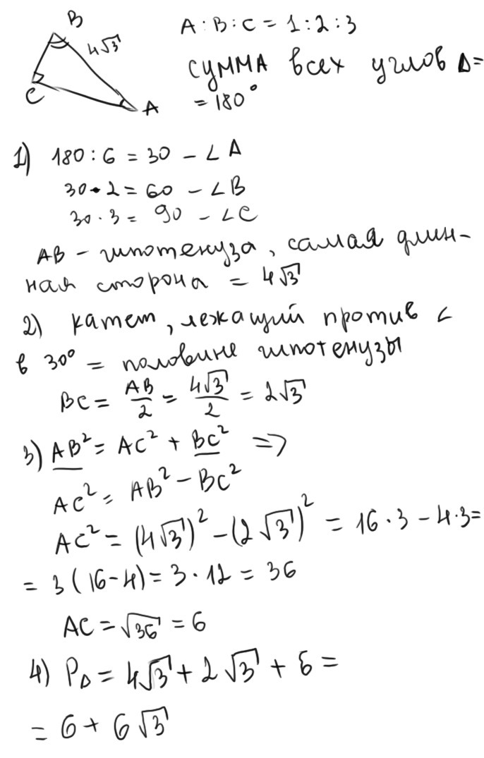 Покажите как Решить,найти периметр треугольника ,если его углы относятся как 1:2:3.Длина большей стороны 4корень из 3 (8бал)