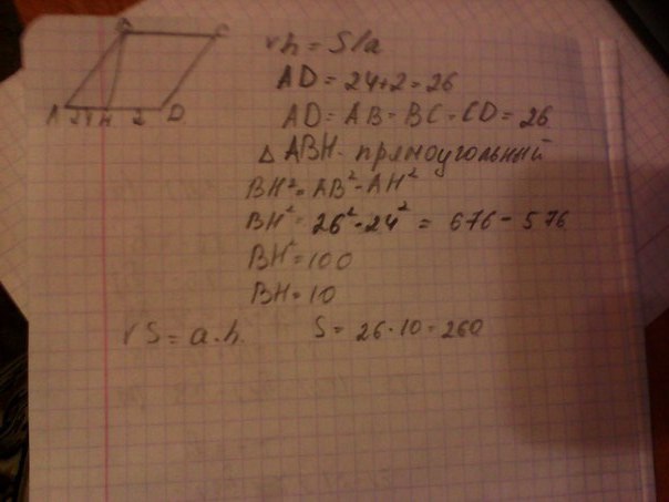 Высота BH ромба ABCD делит его сторону AD на отрезки AH = 24 и HD = 2. как найти отсюда h? объяснить откуда какое число берется
