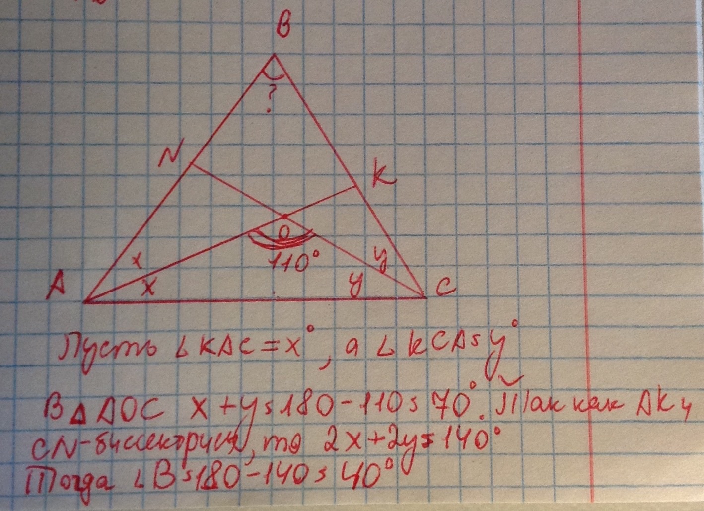 Биссектриса углов а и с треугольника абс пересекаются в точке о. Найдите угол абс, если угол аос равен 110 градусов