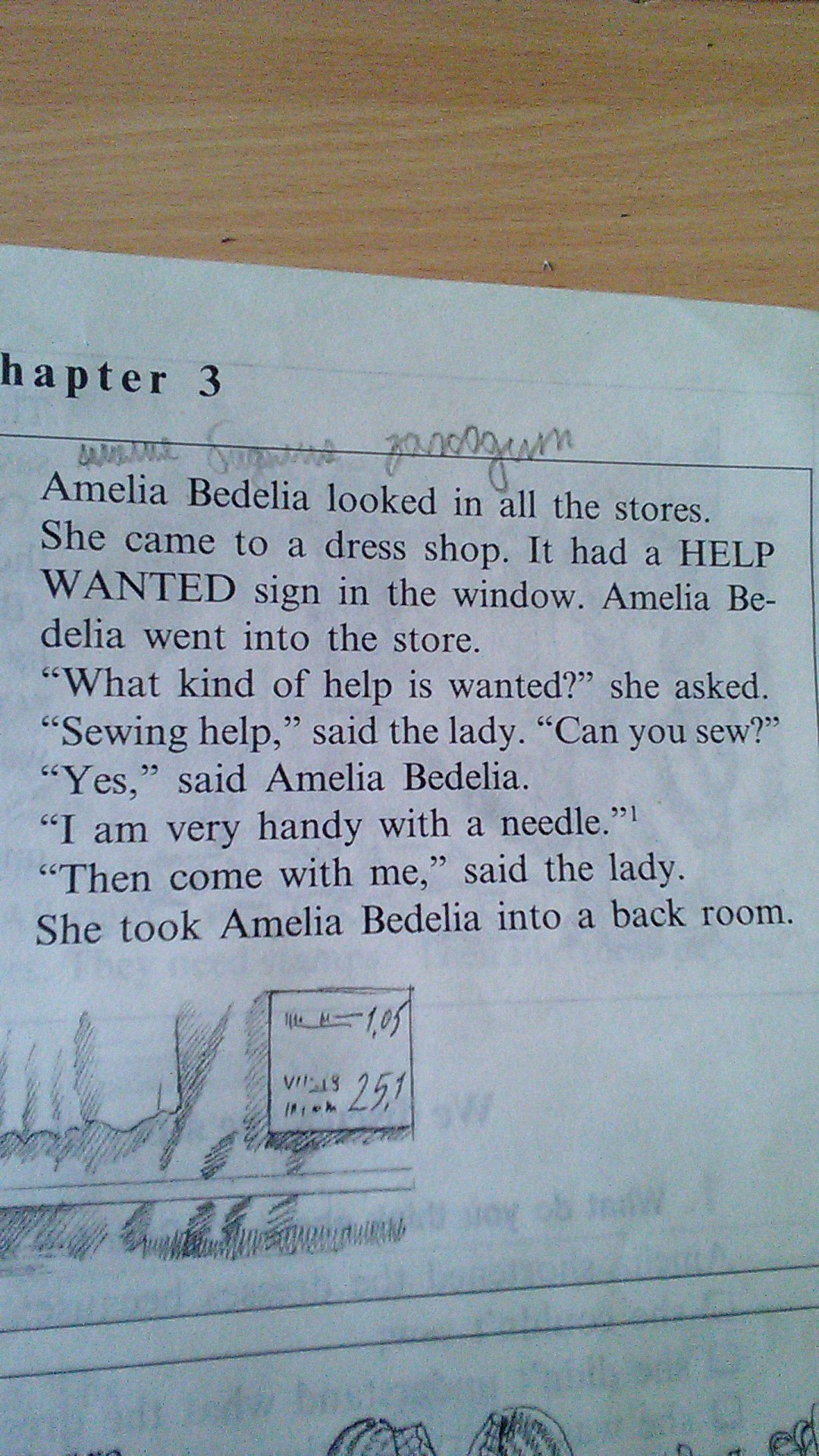 Она пришла в магазин с платьями. На витрине висела вывеска "Нужна помощь" (в смысле "Принимаем на работу"). Амелия Беделия вошла в магазин.