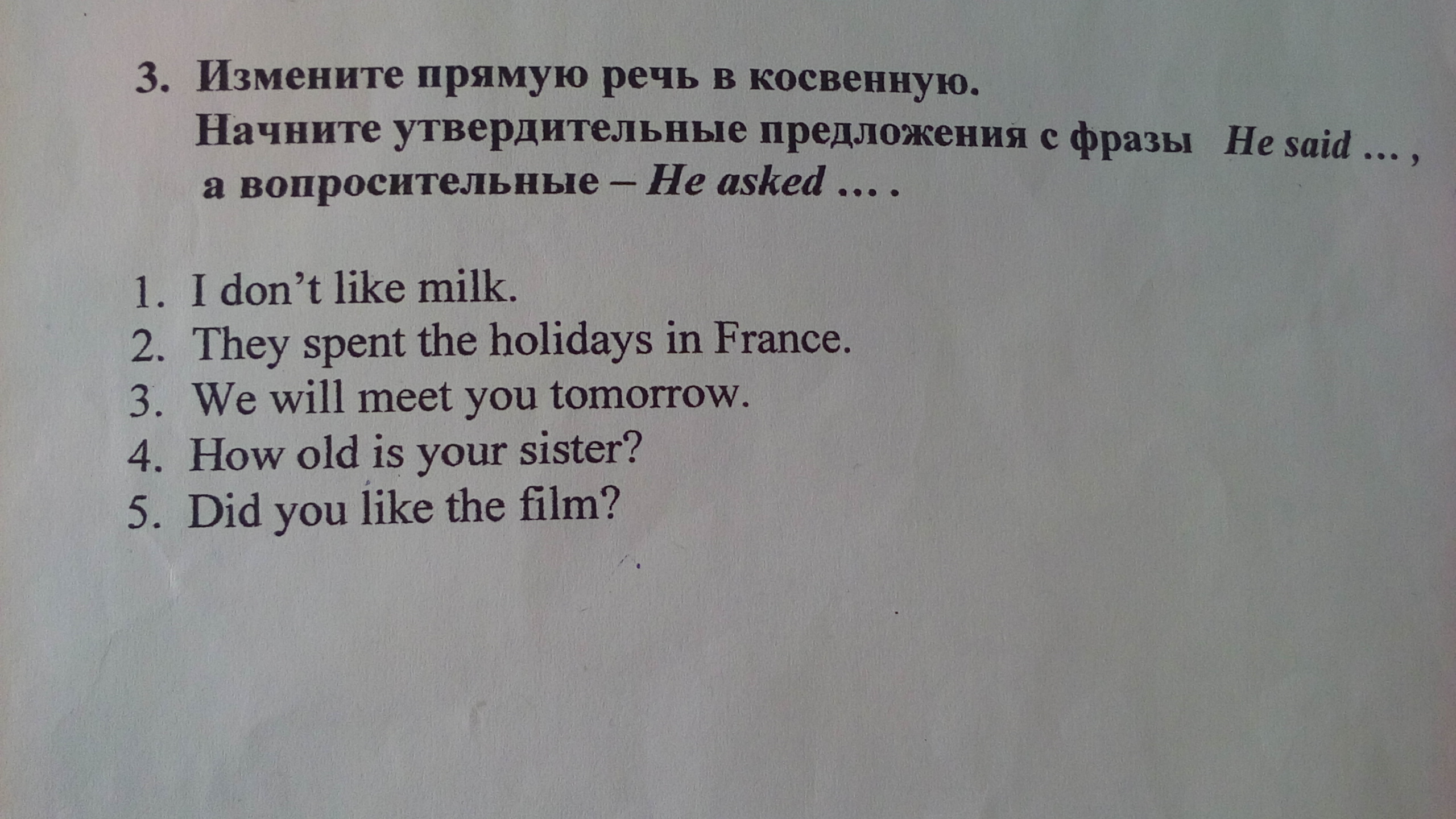 He said that he don't like milk 2. He said that we spent the holidays in France 3. He said that thay will meet you tomorrow. 4. He asked how old is my sister? 5. He asked did i like the film?