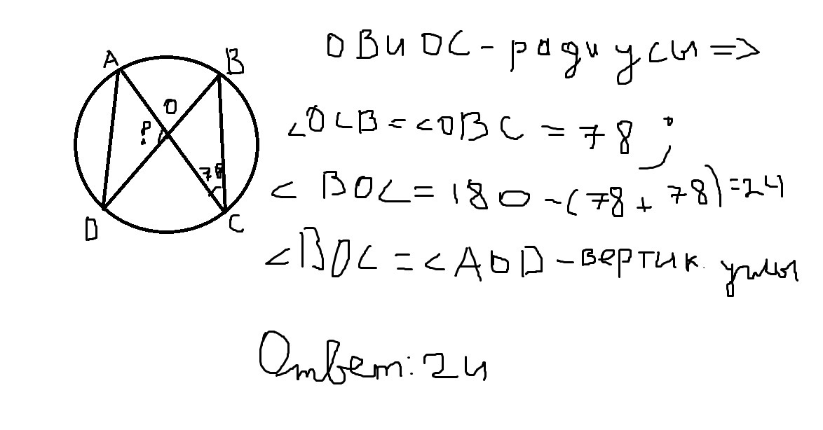 Отрезки AC и ВD - диаметры окружности с центром О. Угол ACB равен 78градусов. Найдите угол АОD.ответ дайте в градусах